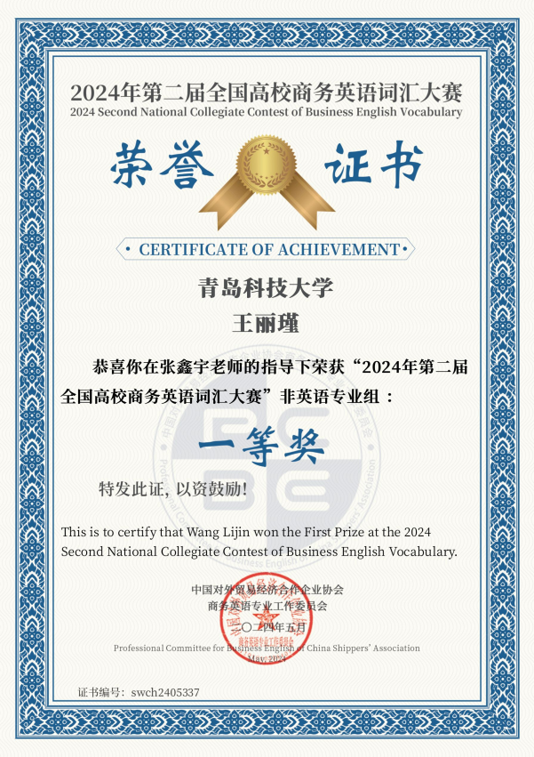 此次竞赛旨在实施《普通高等学校本科外国语言文学类教学质量国家标准》及《普通高等学校本科商务英语专业教学指南》,激发学生英语学习热情,扩展词汇量,深化词汇学习,并提供专业交流与学生展示自我的平台。赛前,学院积极组织学生报名,通过组织商务英语词汇专项模拟赛等形式开展了专项指导,充分的赛前准备夯实了参赛学生的商务英语知识和能力。经过激烈竞争,我院学生王丽瑾荣获一等奖;陈胜蓉、张牧芸荣获二等奖;王雪琪、王梓轩荣获三等奖。